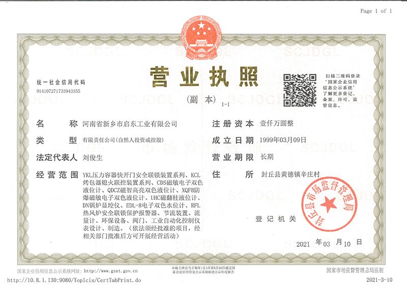 河南省新鄉(xiāng)市啟東工業(yè)有限公司始建于1987年,是專(zhuān)注研發(fā)、生產(chǎn)自動(dòng)化儀器儀表(主要與壓力容器、鍋爐等容器配套使用)的廠(chǎng)家。主要產(chǎn)品有液位計(jì)(磁敏雙色型、磁翻柱型等)系列、烤包器熄火聯(lián)控裝置系列、壓力容器快開(kāi)門(mén)安全聯(lián)鎖保護(hù)裝置系列、鍋爐報(bào)警器系列。二十多年來(lái),公司產(chǎn)品暢銷(xiāo)國(guó)內(nèi)并遠(yuǎn)銷(xiāo)俄羅斯、蒙古與東南亞,深得廣大用戶(hù)的信賴(lài)和好評(píng)。我們多年來(lái)致力于自動(dòng)化儀器儀表的研制生產(chǎn),公司現(xiàn)具有完善的生產(chǎn)、試驗(yàn)、檢測(cè)手段和設(shè)備。科技創(chuàng)新、誠(chéng)信服務(wù),是我們不變的經(jīng)營(yíng)理念,我們將以強(qiáng)有力的技術(shù)支持及售后竭誠(chéng)為客戶(hù)提供良好的服務(wù)?! ?012年我公司成功研發(fā)了KCL系列烤包器熄火聯(lián)控裝置,并于2013年2月2日榮獲中華人民共和國(guó)國(guó)家知識(shí)產(chǎn)權(quán)局辦法的《實(shí)用新型**證書(shū)》<**號(hào):2021202257735>該產(chǎn)品廣泛應(yīng)用于唐鋼等大型鋼鐵企業(yè),為烤包器安全作業(yè)提供了有力的保障。  2002年我公司成功研發(fā)磁敏電子雙色液位計(jì)獨(dú)特的高亮度LED紅綠雙色顯示,獲得了專(zhuān)家的首肯和用戶(hù)的一致好評(píng)。在此基礎(chǔ)上我公司研發(fā)人員十年磨一劍,致力于XQFB-1防爆型磁敏雙色液位計(jì)的研發(fā),于2013年12月27日由國(guó)家防爆電器產(chǎn)品質(zhì)量監(jiān)督檢驗(yàn)中心檢驗(yàn)合格并頒發(fā)防爆合格證書(shū)<編號(hào):cnex19.0883>。該產(chǎn)品性能得到了充分的發(fā)揮,廣泛應(yīng)用于含有Ⅱ類(lèi)A·B級(jí)T1-T4組可燃?xì)怏w或蒸汽與空氣混合形成的爆炸性混合物的0區(qū)、1區(qū)危險(xiǎn)場(chǎng)所。連接用戶(hù)DCS或PLC系統(tǒng)實(shí)現(xiàn)遠(yuǎn)距離集中顯示和控制,從而實(shí)現(xiàn)節(jié)能、數(shù)字化管理。為用戶(hù)增加了一定的經(jīng)濟(jì)效益和社會(huì)效益,。2014年公司成功申請(qǐng)了夢(mèng)潤(rùn)儀表的logo,新的品牌新的形象,夢(mèng)潤(rùn)儀表是啟東的LOGO, 歡迎新老用戶(hù)前來(lái)洽談合作?! ∥覀円蝗缂韧刈⒅乜蒲械耐度耄瑧{借產(chǎn)品的不斷更新、加大科技含量,進(jìn)一步拓展市場(chǎng)。我們相信品質(zhì)成就未來(lái),以過(guò)硬質(zhì)量、優(yōu)惠價(jià)格、完善的售后服務(wù)熱忱歡迎廣大客戶(hù)來(lái)我司視察指導(dǎo)、洽談業(yè)務(wù);精誠(chéng)合作,共創(chuàng)輝煌!